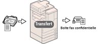 La machine peut être réglée pour transférer automatiquement au destinataire spécifié les documents reçus par fax répondant aux conditions de transfert, avec les réglages d'envoi souhaités. Il est également possible de transférer les documents reçus par fax vers d'autres machines (fonction de relais) ou d'enregistrer les documents confidentiels reçus dans la boîte fax confidentielle. La fonction de transfert automatique peut également être réglée pour se déclencher à une heure spécifiée. Parce qu'il est également possible de transférer vers un destinataire les documents ne répondant pas aux conditions de transfert, cette fonction peut servir à trier et distribuer les documents reçus par fax à leurs destinataires respectifs.