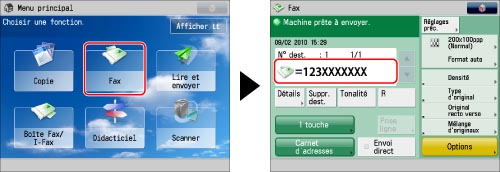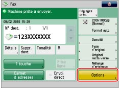 Si [Fax] est réglé sur "Oui" dans Limiter nouveau destinataire, il est impossible d'entrer de nouveaux destinataires. Dans ce cas, sélectionner un destinataire mémorisé dans le carnet d'adresses local, dans le carnet d'adresses distant, sur un serveur LDAP ou sous un bouton de composition 1 touche. (Voir "Restriction de l'envoi à de nouvelles adresses".)