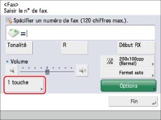 Il est possible de sélectionner un bouton de composition 1 touche pour spécifier un numéro de téléphone ou de fax. Pour plus d'informations sur les boutons de composition 1 touche, voir "Spécification d'un destinataire à l'aide des boutons de composition 1 touche".