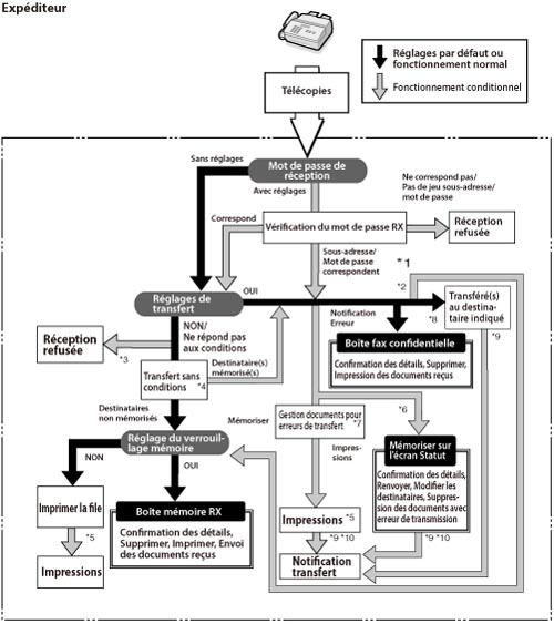 *2 Si [Stocker/impr. doc. reçu] est réglé sur "Oui" sous [Réglages de transfert] (Réglages/Enregistrement > [Réglages de fonction]), les documents transférés sont imprimés ou stockés dans la Boîte mémoire RX.