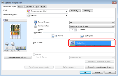 Il est impossible d'utiliser l'impression au format Affiche avec les options "Impression de filigrane", "Mise à l'échelle des documents" ou "Impression de plusieurs pages sur une seule feuille".