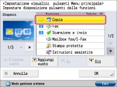 Questa sezione descrive come impostare i tre tipi di tasti: [Copia], [Scansione e memorizzaz.] e [Fax], affinché vengano visualizzati nel pannello digitale nel suddetto ordine.