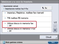 Selezionare [Impostazione mailbox fax/I-Fax] → [Utilizzo blocco in memoria fax].