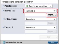 Selezionare l'elenco a comparsa <Numero di fax> → selezionare [È uguale a] → premere [Impos.].