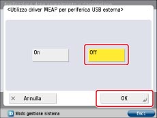 Seguire la procedura riportata di seguito per impostare [Utilizzo driver MEAP per periferica USB esterna] su 'Off'.