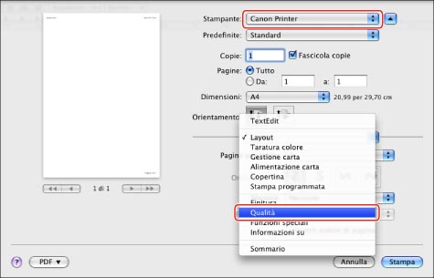 Selezionare la stampante da utilizzare → selezionare [Qualità].