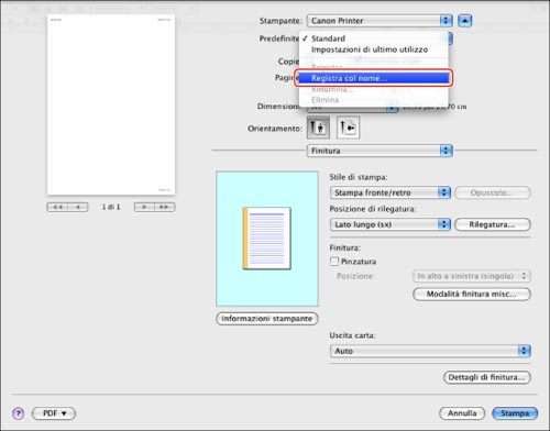È possibile salvare le impostazioni specificate in ogni pannello della finestra di dialogo relativa alla stampa Mac come preimpostazioni. Una preimpostazione è una combinazione di funzioni di stampa usate di frequente salvate come un'unica impostazione. È possibile specificare facilmente le impostazioni di stampa in base alle proprie esigenze selezionando semplicemente una preimpostazione registrata precedentemente.