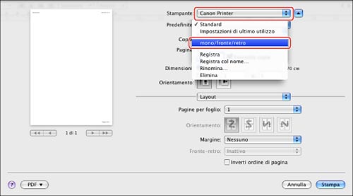 Selezionare la stampante da utilizzare → premere l'elenco a comparsa <Predefinite> → selezionare [mono/fronte/retro].