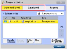 Se è stato effettuato l'accesso come amministratore SSO-H, vengono visualizzati i processi inviati da tutti gli utenti ed è possibile visualizzare i dettagli o annullare i processi. Tuttavia, i documenti protetti crittografati possono essere stampati solo dall'utente che li ha inviati.