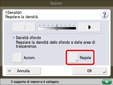 La selezione di [Regola] per la <Densità sfondo> e la regolazione con precisione annullano l'impostazione [Autom.] per la <Densità sfondo>. Allo stesso modo, dopo la regolazione manuale, premendo [Autom.] per la densità vengono annullate le regolazioni eseguite. La macchina regola automaticamente la densità in base allo sfondo.