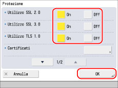Non è possibile usare SSL quando <Utilizzo SSL 2.0>, <Utilizzo SSL 3.0> e <Utilizzo TLS 1.0> sono tutti impostati su 'Off'.