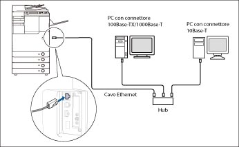 Per utilizzare 10Base-T/100Base-TX, collegare il connettore RJ-45 della macchina a una porta dell'hub tramite un cavo LAN a doppini intrecciati di categoria 5. Per utilizzare 1000Base-T, si consiglia di impiegare un cavo LAN a doppini intrecciati di categoria avanzata 5.