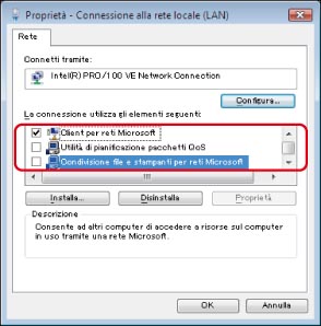 Nella finestra di dialogo [Proprietà - Connessione alla rete locale (LAN)], selezionare [Client per reti Microsoft] e [Protocollo Internet (TCP/IP)]/[Internet Protocol Version 4 (TCP/IPv4)].
