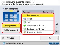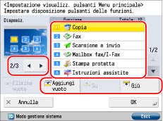 Se il numero dei pulsanti di selezione delle funzioni supera il numero di pulsanti nel layout specificati per <Impostazione visualizzazione pulsanti Menu principale>, i pulsanti in eccesso vengono visualizzati dopo la pagina 2 della schermata Menu principale. Sulla schermata Menu principale si possono visualizzare non più di nove pulsanti.