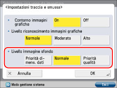 Se si aumenta <Livello riconoscimento immagini grafiche>, aumenta anche la dimensione dei dati. È consigliabile selezionare dapprima il livello [Normale] e, se il risultato ottenuto non è soddisfacente, provare ad aumentare il livello impostando [Moderato] o [Alto].