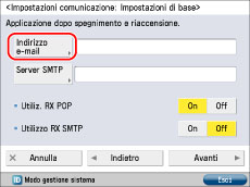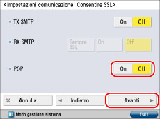 Selezionare [On] per <Utiliz. RX POP> → [Off] per <Utilizzo RX SMTP> → [Avanti].