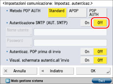 Selezionare [Off] per <Autenticazione SMTP (AUT. SMTP)> → premere [Off] per <Autenticaz. POP prima di invio>.