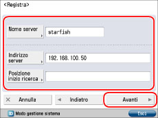 Selezionare [Indirizzo server] → digitare l'indirizzo del server → premere [OK].