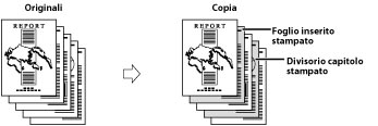 Questo modo consente di inserire un foglio tra le copie. È utile quando si desidera utilizzare un foglio in bianco per ordinare le copie. Sui fogli di separazione è anche possibile copiare. Il modo Divisori capitoli esegue sempre la copia su un lato del foglio di separazione. È utile quando si desidera organizzare le copie per capitolo.
