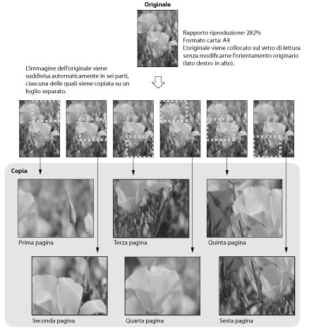mentre è in corso la copiatura per annullare il lavoro di copiatura e si preme poi , la copiatura riprende dal primo foglio dell'immagine divisa.Dopo avere incollato tutti i fogli insieme, il formato finale della copia effettiva sarà leggermente più piccolo del formato riportato nella tabella in "Calcolo del numero di fogli in cui suddividere l'immagine in base al rapporto di riproduzione".