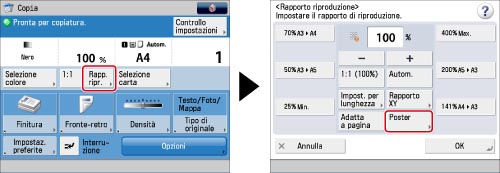 È possibile creare un poster utilizzando rapporti di riproduzione non indicati nella tabella "Calcolo del numero di fogli in cui suddividere l'immagine in base al rapporto di riproduzione". Il formato dell'originale non deve però essere maggiore del formato A3 ed il rapporto di riproduzione non deve essere maggiore del 400%.