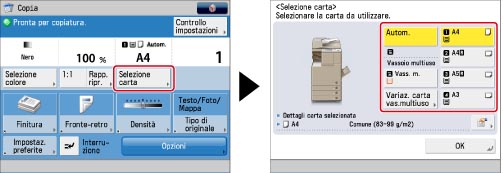 Eseguendo l'impostazione preventivamente, è possibile fare in modo che le icone che indicano il tipo di carta in ciascun cassetto vengano visualizzate nelle videate di selezione carta. (Vedere "Registrazione/modifica dei tipi di carta personalizzati".)
