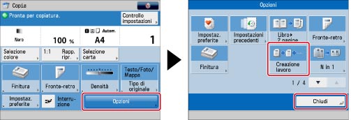 Possono essere variate solo le impostazioni visualizzate in [Variazione impostazioni] nel modo Creazione lavoro. Specificare in anticipo le impostazioni di copia/scansione necessarie. Il tipo di originale, la densità e le impostazioni di selezione colore non possono però essere variati se si imposta il modo N in 1 insieme al modo Creazione lavoro.