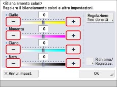 Per regolare la densità di ciascun colore, premere [Regolazione fine densità]. Selezionare il colore da regolare → premere [-] o [+] per regolare il livello di densità delle aree con una densità più scura (alta), con una densità media e con una densità più chiara (bassa) → selezionare [OK].