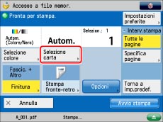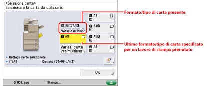 Se sono stati prenotati più lavori per la stampa, nella schermata Selezione carta viene visualizzato solo il formato/tipo di carta impostato per l'ultimo lavoro che è stato prenotato.