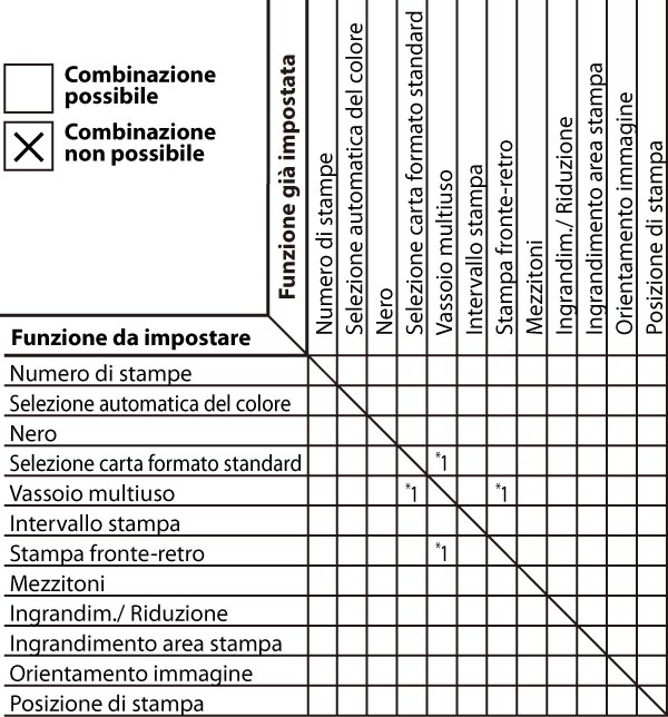 Nelle tabelle riportate di seguito vengono indicate le combinazioni di impostazioni possibili quando si vogliono utilizzare più funzioni per volta.