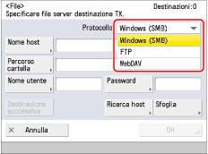 Quando si seleziona [FTP] o [WebDAV] come protocollo di server, è anche possibile specificare un numero di porta dopo l'indirizzo del nome host digitando un segno di due punti (:) seguito dal numero di porta.