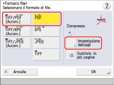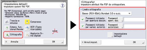 Se si richiamano le impostazioni del PDF protetto premendo [Impostaz.precedenti], la password non viene richiamata e i campi [Password apertura docum.] e [Password autorizzaz.] risulteranno vuoti.