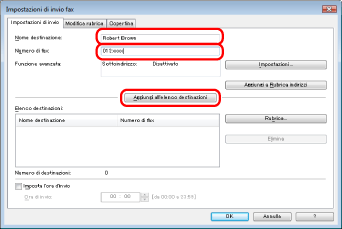 Immettere il nome del destinatario e il numero di fax nella scheda [Impostazioni di invio] → fare clic su [Aggiungi all'elenco destinazioni].