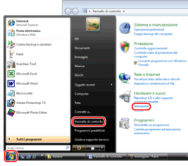 ] (Fare clic per iniziare) → [Pannello di controllo] → [Stampante].