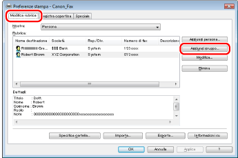 È inoltre possibile modificare le informazioni di gruppi di destinatari precedentemente registrati. Per ulteriori informazioni, fare clic su [?] nell'angolo inferiore destro della finestra del driver del fax per visualizzare la Guida in linea.