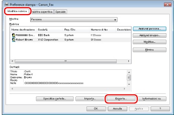 Selezionando [Impostare la protezione mediante password per l'esportazione dell'elenco indirizzi] nella finestra di dialogo [Impostaz.protezione] della scheda [Speciale], facendo clic su [Esporta] viene visualizzata una finestra di dialogo per l'inserimento di una password. Per informazioni dettagliate, consultare la Guida in linea (vedere "Visualizzazione della Guida in linea").