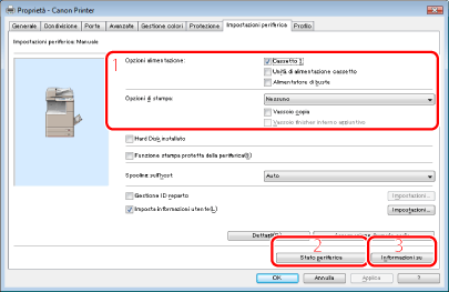 È possibile richiamare le informazioni sulla periferica e aggiornare le impostazioni visualizzate nella scheda. (Vedere "Impostazione delle opzioni della stampante").