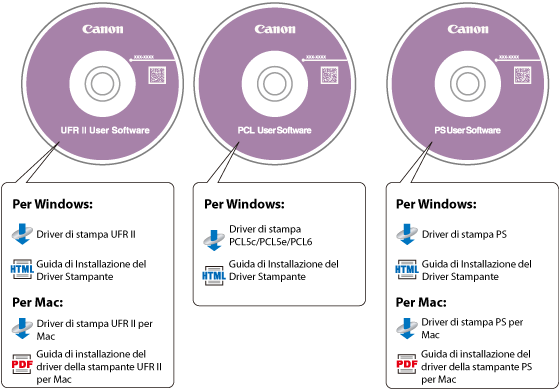 Se sono stati forniti più CD-ROM, utilizzare le seguenti informazioni come riferimento e scegliere il CD-ROM e il driver della stampante appropriati.