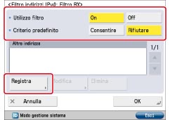 Selezionare [On] per <Utilizzo filtro> → selezionare [Rifiutare] per <Criterio predefinito> → selezionare [Registra].
