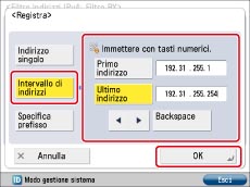 Selezionare [Intervallo di indirizzi] → selezionare [Primo indirizzo] e digitare '192.31.255.1' → selezionare [Ultimo indirizzo] e digitare '192.31.255.254' → selezionare [OK].
