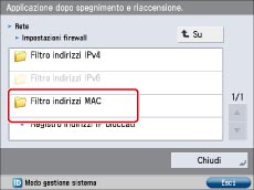 L'indirizzo MAC è un codice identificativo univoco della scheda di rete. Tale indirizzo non cambia anche se viene modificato l'indirizzo IP. Oltre all'indirizzo IP, è possibile impostare il filtro invio e il filtro ricezione per l'indirizzo MAC. Per impostare il filtro per l'indirizzo MAC, attenersi alla procedura riportata di seguito.