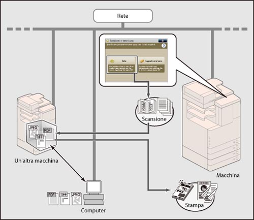 È possibile salvare gli originali acquisiti dalla macchina nell'Area di condivisione di un'altra macchina della serie imageRUNNER ADVANCE remota e accessibile in rete. È inoltre possibile richiamare i file salvati in un'Area di condivisione in rete e stamparli dalla macchina.