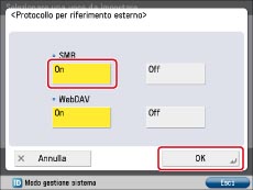 Selezionare [On] per [WebDAV] → selezionare [OK] → [OK].