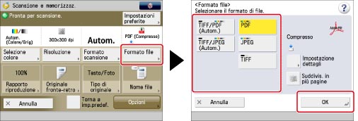Selezionare [Formato file] → selezionare un formato di file → premere [OK].