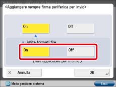 Selezionare [Aggiungere sempre firma periferica per invio] → [On] per <Aggiungere sempre firma periferica per invio> → specificare le impostazioni per <Limite formati file>.