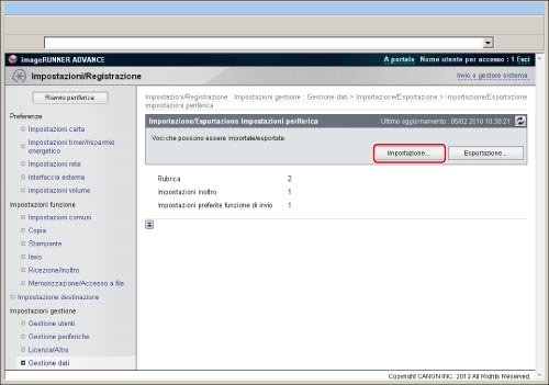 Dopo avere importato le impostazioni di Impostazioni/Registrazione, non sarà possibile utilizzare l'IU remota sino al riavvio della macchina. Spegnere e riaccendere la macchina con l'interruttore principale.