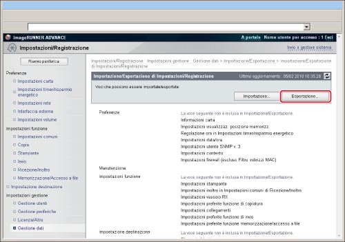 Le impostazioni della periferica possono essere registrate come file nel computer. Anche la rubrica è compresa nelle impostazioni della periferica. Anche le impostazioni preferite sono comprese nel file delle impostazioni della periferica esportato dalla macchina.