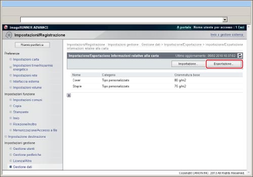 Fare clic su [Impostazioni/Registrazione] → selezionare [Gestione dati] per <Impostazioni gestione>.