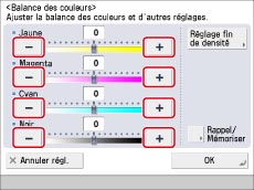 Per regolare la densità di ciascun colore, premere [Regolazione fine densità]. Selezionare il colore da regolare → premere [-] o [+] per regolare il livello di densità delle aree con una densità più scura (alta), con una densità media e con una densità più chiara (bassa) → selezionare [OK].