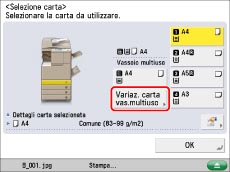 Se è impostato 'On' per [Registr.impost.predefinite vassoio multiuso] in Impostazioni utilizzo periferica ed il formato/tipo di carta è stato registrato, il formato/tipo di carta selezionato viene visualizzato sulla schermata. (Vedere "Registrazione delle impostazioni predefinite del vassoio multiuso".)